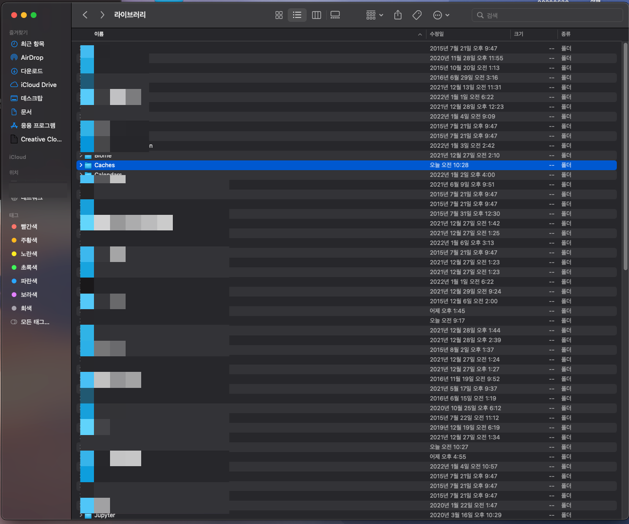 폴더 내에서 'Caches폴더'를 찾아서 제거