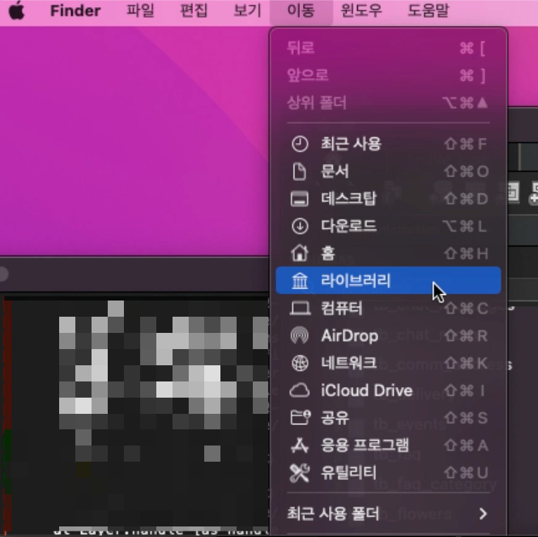 키보드에서 'option 키'를 누르면 없었던 '라이브러리' 가 생기는데 클릭